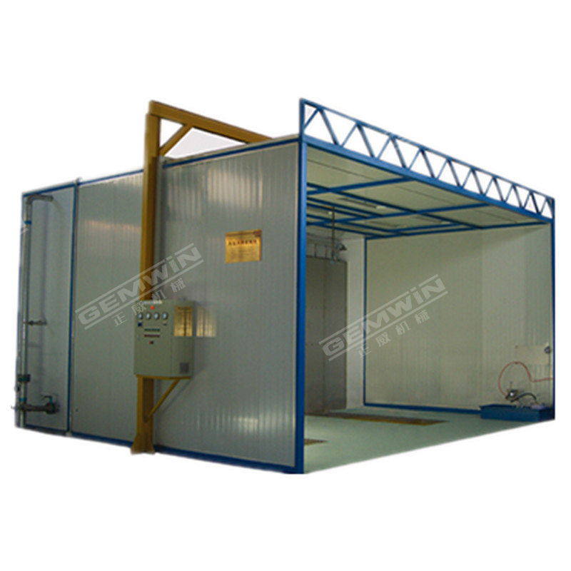 水簾噴漆室采用后部側(cè)抽風(fēng),利用流動的簾狀水層來收集并將涂料及涂料顆粒沿著水幕帶至噴漆室底部水槽,沿槽邊溢流,在水簾板上形成一層均勻的水幕,并順著水簾板均勻地流入底部儲水槽內(nèi),水簾板掛在噴涂工件前方,這樣工件的前方形成一簾狀水層。噴涂工件時,過噴的涂料隨簾狀水層流入水槽內(nèi),有機氣體及氣霧隨排風(fēng)機的牽引進入抽風(fēng)系統(tǒng),在水簾板底部窩卷板的作用下,水被高速流動的空氣卷起,使水與空氣充分混合,講空氣中的氣霧及涂料顆粒又被反彈從而又被水捕捉到水槽中。