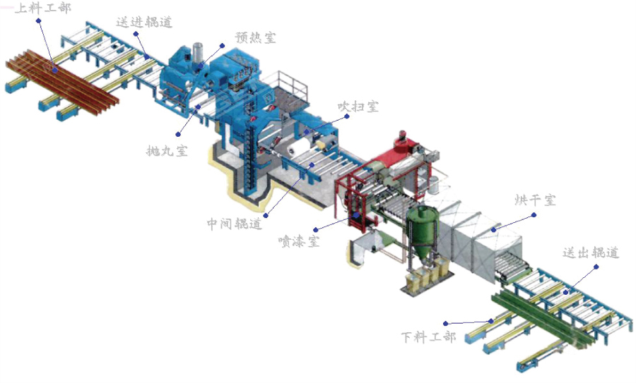 Q69系列鋼材預(yù)處理線是吸取國(guó)內(nèi)外同類產(chǎn)品優(yōu)點(diǎn)而設(shè)計(jì)制造的。除銹工部主機(jī)(拋丸清理)采用了懸臂離心式高效拋丸器,滿幕簾式丸砂分離器;清掃工部采用特制高強(qiáng)度尼龍滾刷和高壓風(fēng)機(jī)二級(jí)清掃裝置;預(yù)熱和烘干工部采用多種加熱方式;噴漆工部采用高壓無氣噴涂方式。該成套設(shè)備采用PC機(jī)控制。屬于九十年代國(guó)際先進(jìn)水平的大型成套設(shè)備。