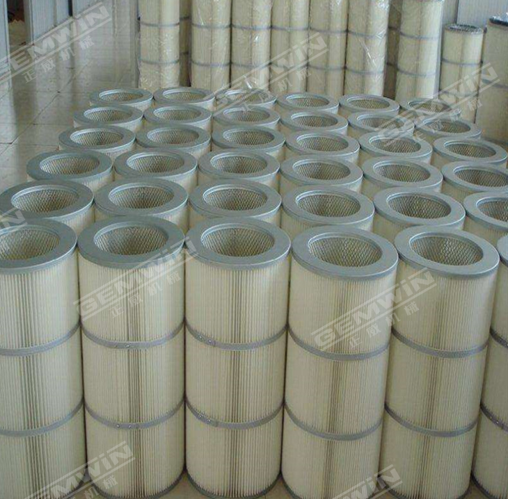 濾筒的品種較多,有細而長與粗而短之分。細長濾筒(如φ≤160,L=1~2m),其褶(如45褶)間空隙大、夾角大,褶少而淺,過濾面積比同徑同長的濾袋大2~5倍,清灰易而效果好;適用于濃度≥15g/m粉塵的過濾除塵,過濾風速0.6~1.2m/min。粗短濾筒(如φ350,L=0.66m)直徑大、長度短、褶多(120~350褶)而深、褶間空隙小,過濾面積大,較之同徑同長濾袋面積大14~35倍,適于場地面積小、空間小的地方布置;但因褶角小,粉塵易積聚,難于清灰,適于濃度≤5g/m粉塵的過濾除塵,過濾風速不宜>0.6m/min。